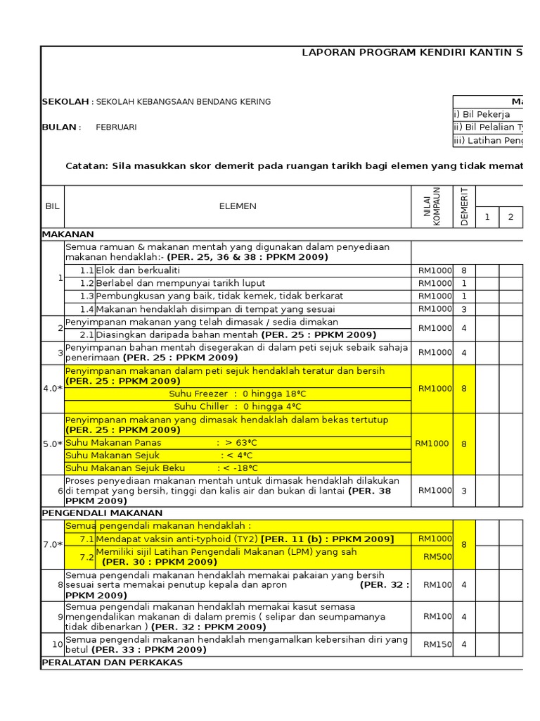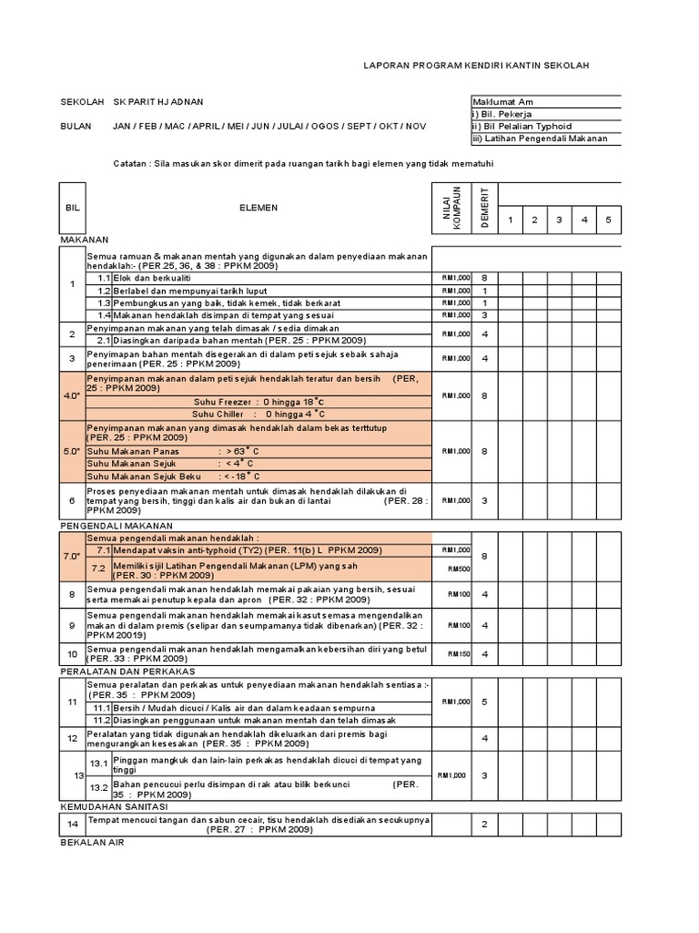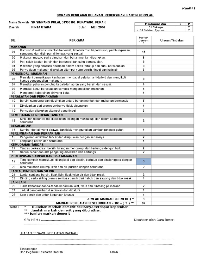 Borang Laporan Kendiri Kantin 2019 from imgv2-1-f.scribdassets.com Permohonan tahun satu bagi ambilan 2018 dan 2019 akan dibuka pada 1 mac 2017 sehingga 30 april 2017. Mukasurat 2 daripada 2 borang penilaian bulanan kebersihan kantin / dapur asrama warga bukan warga negara negara premis Borang akuan penerima bantuan kwapm terkini. Borang laporan harian kendiri kantin. Bagi peringkat awal di permulaan tahun, guru perlu membuat penilaian kendiri iaitu menilai sendiri diri guru terhadap proses pembelajaran dan pemudahcaraan yang dilaksanakan di dalam kelas. Kendiri 2 borang penilaian bulanan kebersihan kantin. Januari 2013 bulan bil makanan ramuan dan makanan mentah berkualiti, label mematuhi peraturan, pembungkusan sempurna dan disimpan. Berikut merupakan borang pdpc standard 4 untuk.