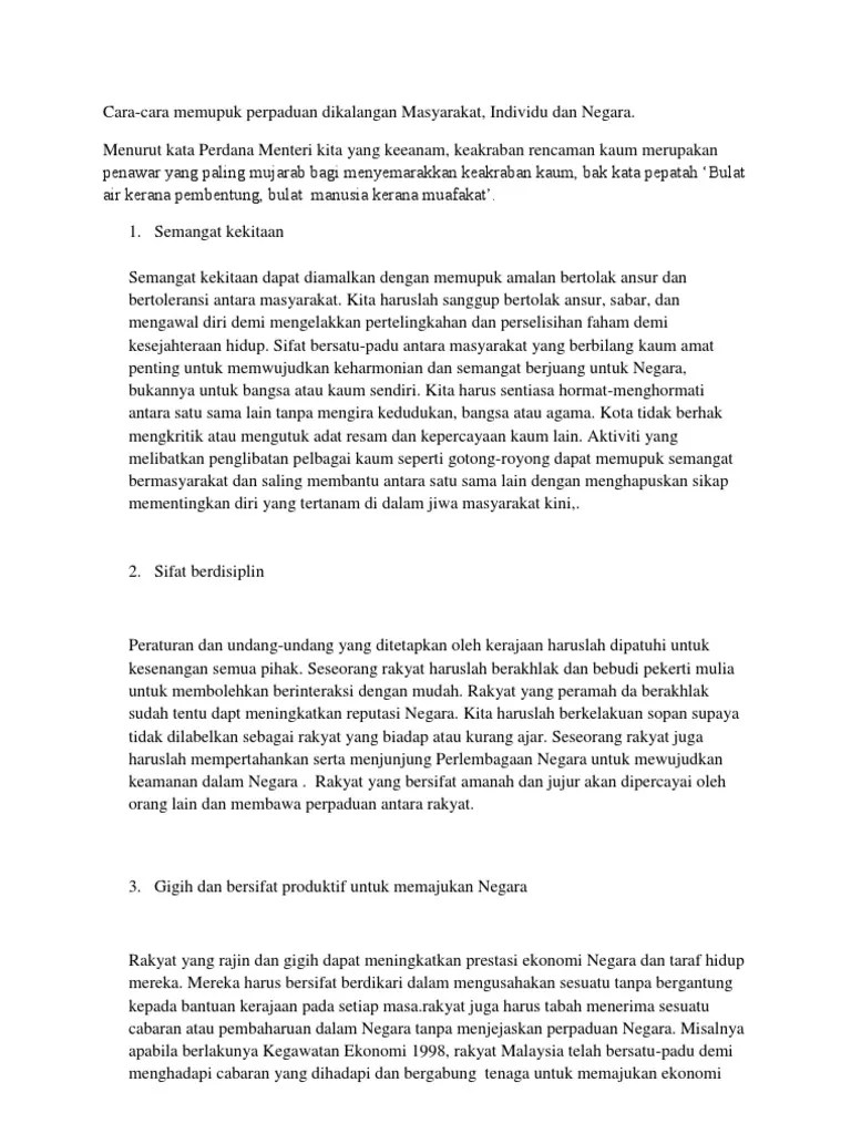 Kepentingan perpaduan kaum 2 dalam hal ini,perpaduan kaum amat penting untuk mengekalkan kestabilan politik. Masyarakat mengelak daripada menimbulkan sesuatu yang sensitif kepada sesuatu kaum. Perpaduan pelbagai kaum melalui kontrak sosial.permuafakatan tersebut. Tapak karangan pmr 1 : Dalam konteks kepelbagaian ini, perpaduan rakyat malaysia sememangnya penting.