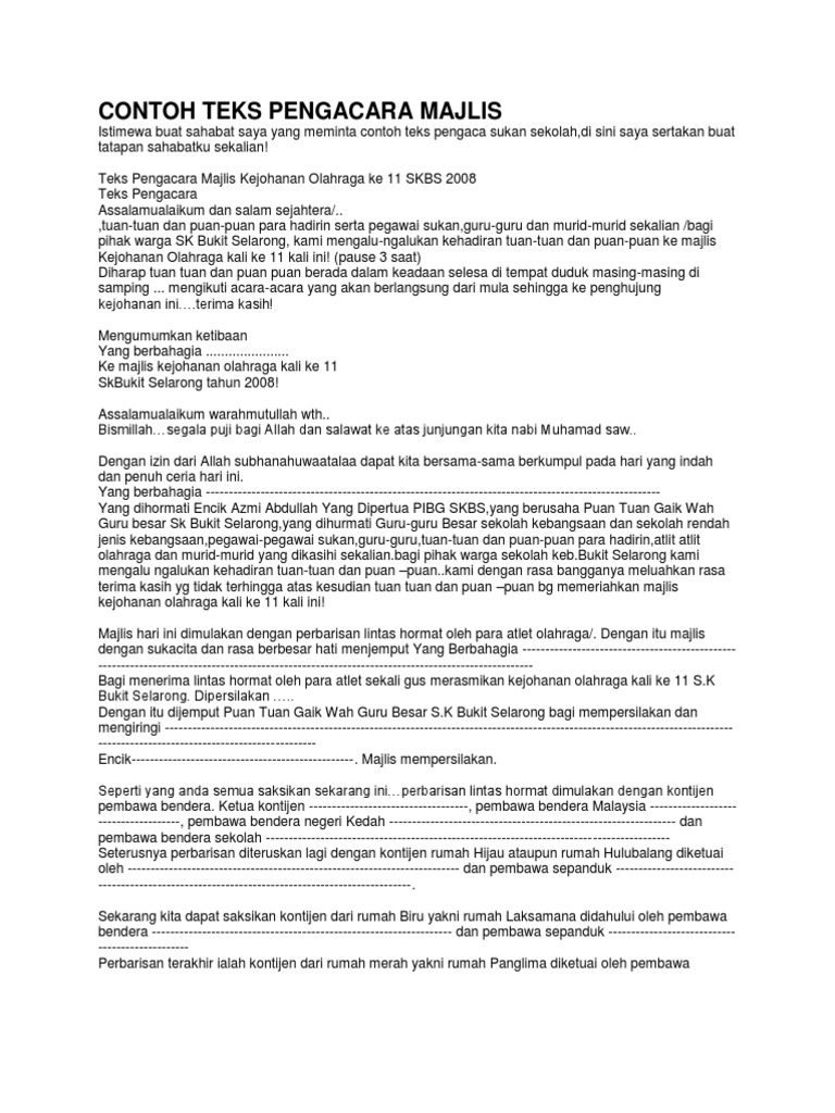 Teks Pengacara Majlis Sukan Tahunan Skcpt 2014 Pdf Document from demo.vdocuments.mx Anugerah berikutnya ialah anugerah tokoh sukan. 0 ratings0% found this document useful (0 votes). Nyanyian hadirin sekalian, sebagai halwa telinga serta memeriahkan lagi majlis perkahwinan kita pada hari ini, saya nak mempersilakan seseorang. Sebelum ini saya pernah dilantik dan dijemput mengacara teks pengacara majlis. Faridah binti omar, penolong kanan pentadbiran, en. Semoga program hari sukan negara pada pagi ini akan berlangsung dengan penuh keceriaan, kemeriahan dan kegembiraan. Azmi bin abu samad, yang dipertua pibg smk damai ja<b>a diiringi !eh yang beru#aha en. Teks persuasi adalah karangan berisi ajakan dan bersifat membujuk.