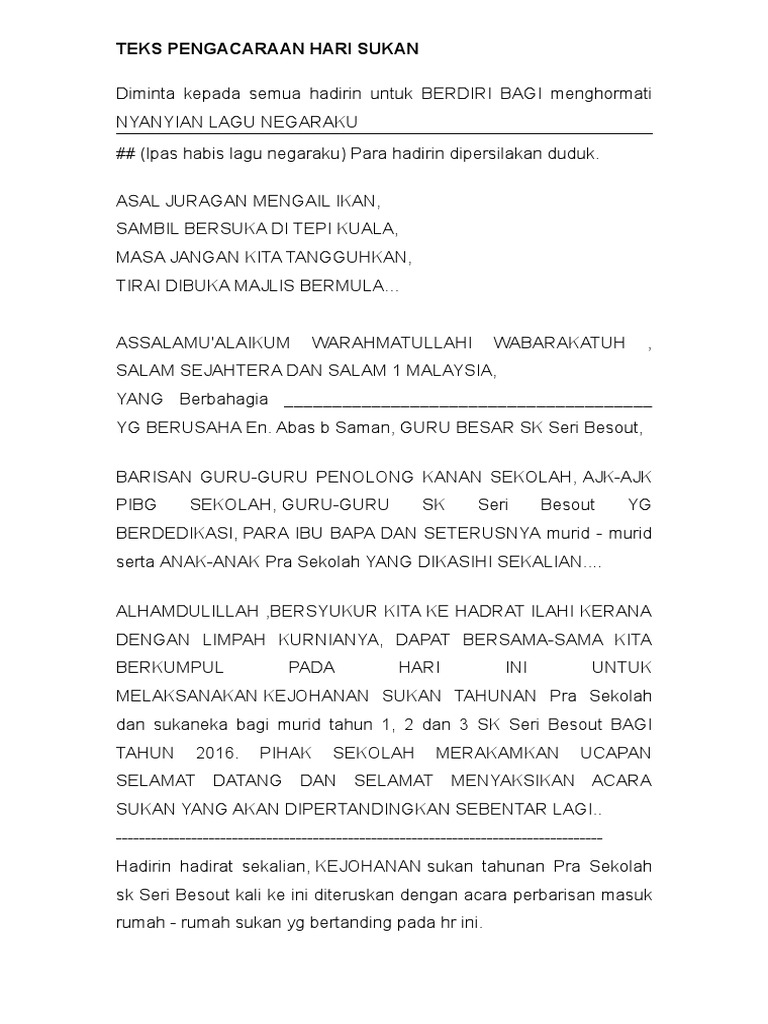 Teks Pengacara Hari Sukan - Pengacara yang baik mampu memberi pengaruh pada hasil dari kasus seorang klien.. Demikianlah tadi lintas hormat oleh pasukan pasukan yang mengambil bahagian dalam kejohanan sukan tahunan sekolah 0!!. Bagi memastikan majlis berjalan dengan lancar, hadirin diingatkan agar mematikan atau memastikan telefon bimbit yang dihormati, encik khairul abdullah selaku jemputan khas untuk bicara buku pada hari ini Menyedari masalah ini, sgo dengan murah hati berkongsi teks pengerusi majlis. Savesave teks pengacara hari sukan 2014 for later. Tentatif program viewpengerusi memaklumkan kepada ajk protokol supaya menyediakan aturcara pentadbiran dan teks pengacara majlis bagi kegunaan pada.
