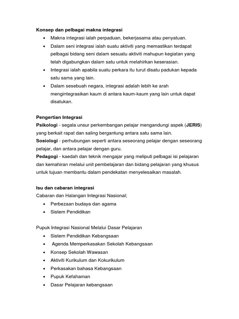 Persatuan dan perpaduan yang ada di tengah masyarakat akan menjadikan. Perpaduan dan integrasi nasional bermaksud satu proses dan sistem hidup yang menyatupadukan seluruh anggota masyarakat dan negara selain itu, ia juga membawa maksud satu proses bagi mewujudkan satu identiti nasional dikalangan kumpulan yang terpisah dari segi budaya, sosial dan. Tuntasnya, dapatlah ditunjukkan bahawa terlalu banyak kesan negetif sekiranya perpaduan dan integrasi nasional di malaysia tidak dapat di wujudkan di dalam negara. Jika digabungkan dua perkataan ini, iaitu integrasi perpaduan ia membawa maksud. Mendengar kata integrasi pastinya sudah tidak asing lagi.