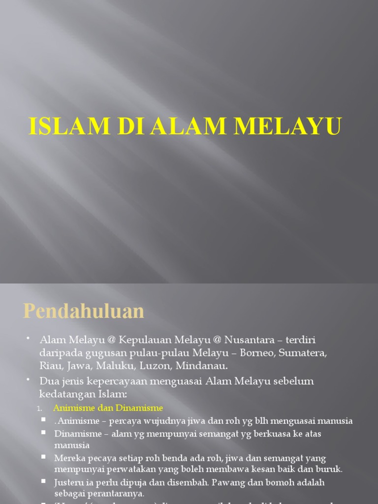 Kedatangan Islam Ke Alam Melayu from img.dokumen.tips Karya pensejarahan islam dan pengaruhnya. Pengaruh islam dalam tamadun melayu. Islam telah berperanan mencorakkan masyarakat melayu di alam melayu ke arah yang lebih dinamik dan berdaya maju. Terpengaruh dari sistem pendidikan islam di timur tengah, pengajian berbentuk halaqah, pondok dan pesantren lahir di alam melayu. Impak tauhid tersebut menyebabkan kesan berlaku itu merangkumi rupa dan jiwa masyarakat di alam melayu ini. Bukti adanya pengaruh islam pada seni bangunan ada pada masjid dan makam. Pengaruh kedatangan islam terhadap masyarakat melayu tradisional. Kesan dan pengaruhnya dalam pelbagai aspek.